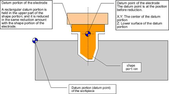 When you use an electrode to process a workpiece by EDM, you must clarify the relation between positions of the electrode and the workpiece. The coordinate position for this is called "a datum point" and the part where the datum point is set is called "datum portion". The position data of the "datum point" of the electrode to that of the workpiece must be instructed as a design value before machining. In addition, the "datum portion" of an electrode largely influences efficiency of centering work on an EDM, and it is necessary to design it in the shape that is considered about efficiency of centering work.